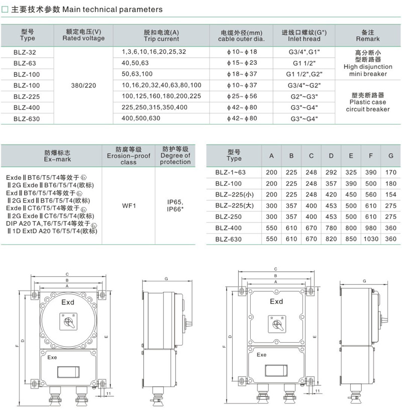 BLZ防爆斷路器開關箱防爆電器廠家支持非標定制。防爆斷路器可以用來分配電能,適合不頻繁地起動異步電機,具有過載、短路、欠壓保護功能,當發生故障時可以自動切斷電源。隔爆型外殼把可能產生火花、電弧和危險溫度的部件與外部隔開,從而達到防爆的目的。